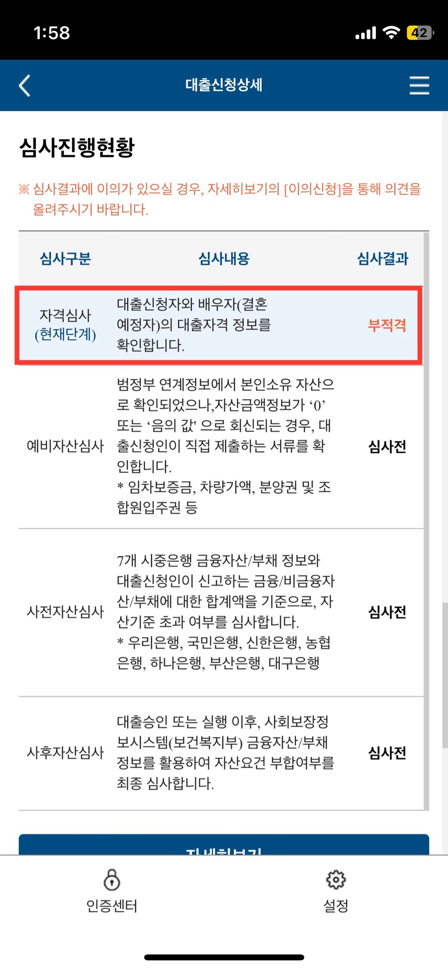 대출을 신청하고 자격심사 단계 여기서 다른 대출이 있다면 부적격 판정된다. 내역보기를 눌러보면 내가 입력한 정보를 확인할 수 있으며 심사진행현황을 확인할 수 있다.